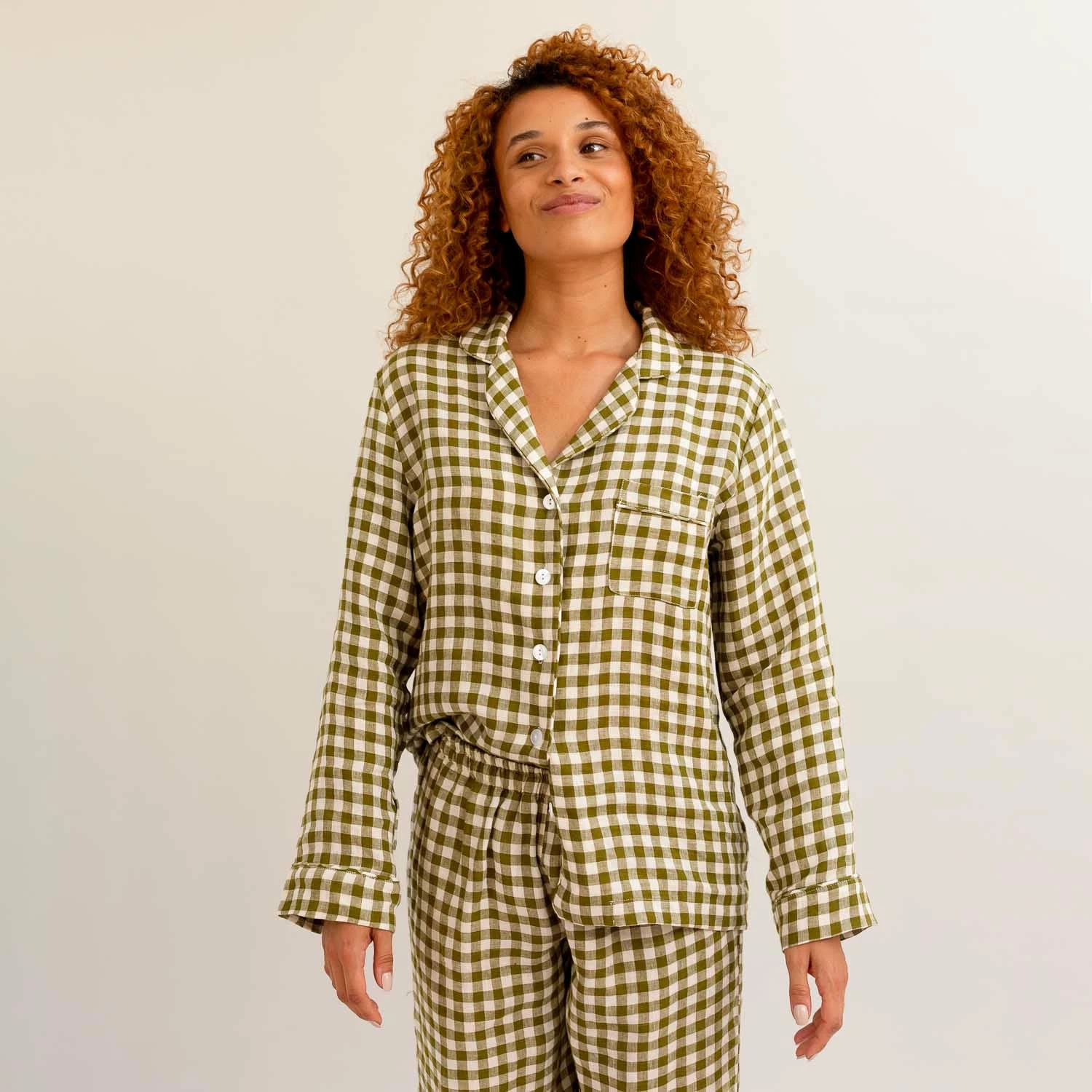 Made for those who like their sleepwear to be timeless yet comfortable, our Botanical Green Gingham Pajama Shirt is made from super soft 100% stonewashed linen. Linen keeps you cozy and warm in the winter and cool in the summer. Our linen pajama shirt can be paired with our pajama pants to complete the look.