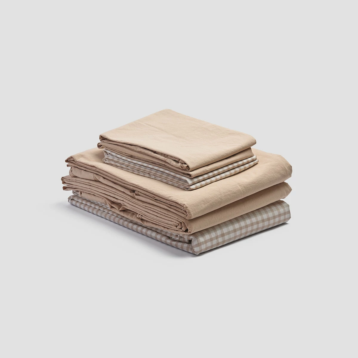 Our most-loved print: Gingham, is now available in crisp percale cotton. Made in Portugal from 100% cotton, our Cotton Gingham Bundle will add a charming, country-inspired feel to your bedroom. The percale weave allows for a matte finish, high breathability and relaxed look – perfect for lovers of high quality cotton bedding. Curate a unique bedtime look, sentimental to you and mix and match to your heart’s content. Our Cafe au Lait Gingham range looks utterly charming as a mono-print ensemble, but pairs beautifully with plain washed cotton colors: White, Parchment or Cafe au Lait.