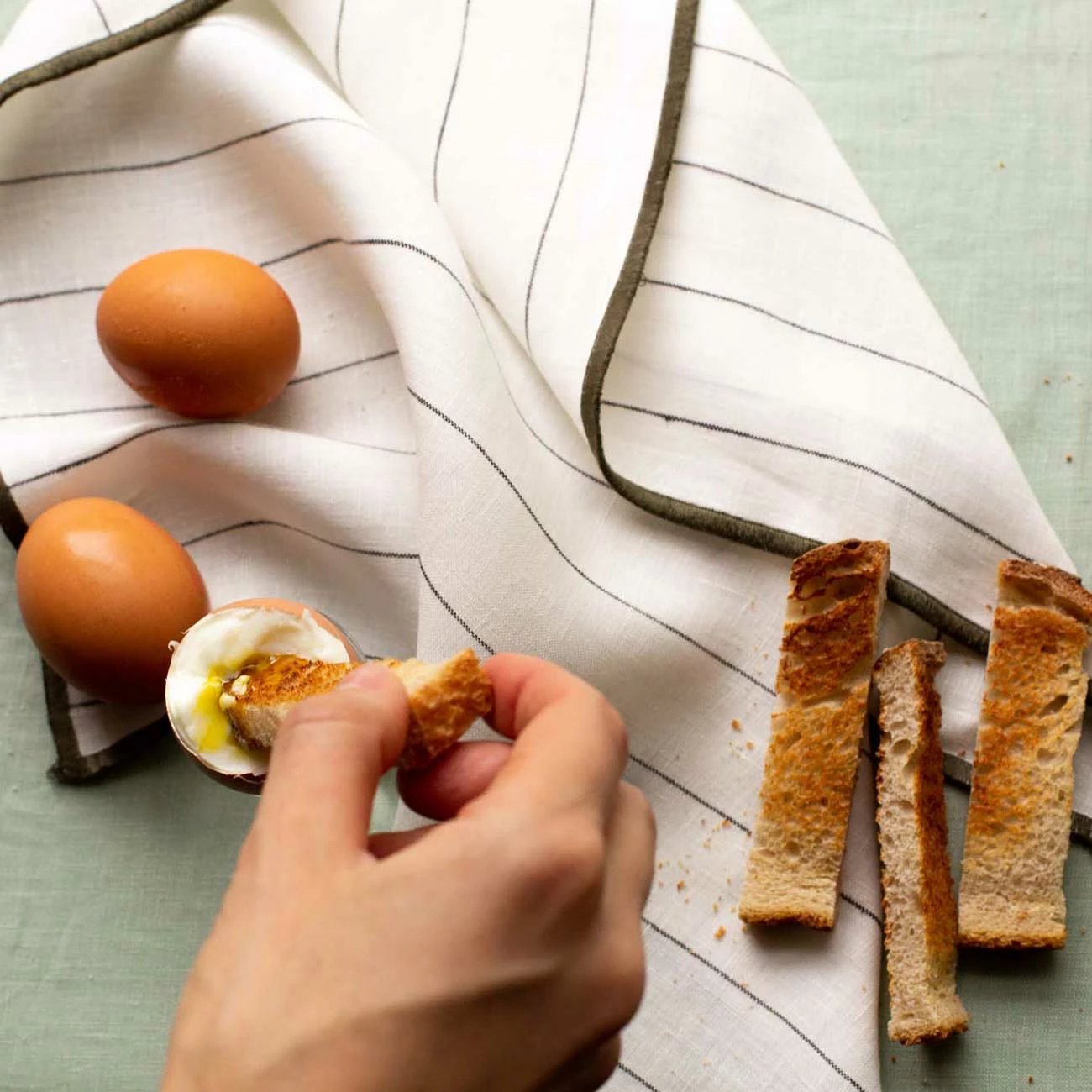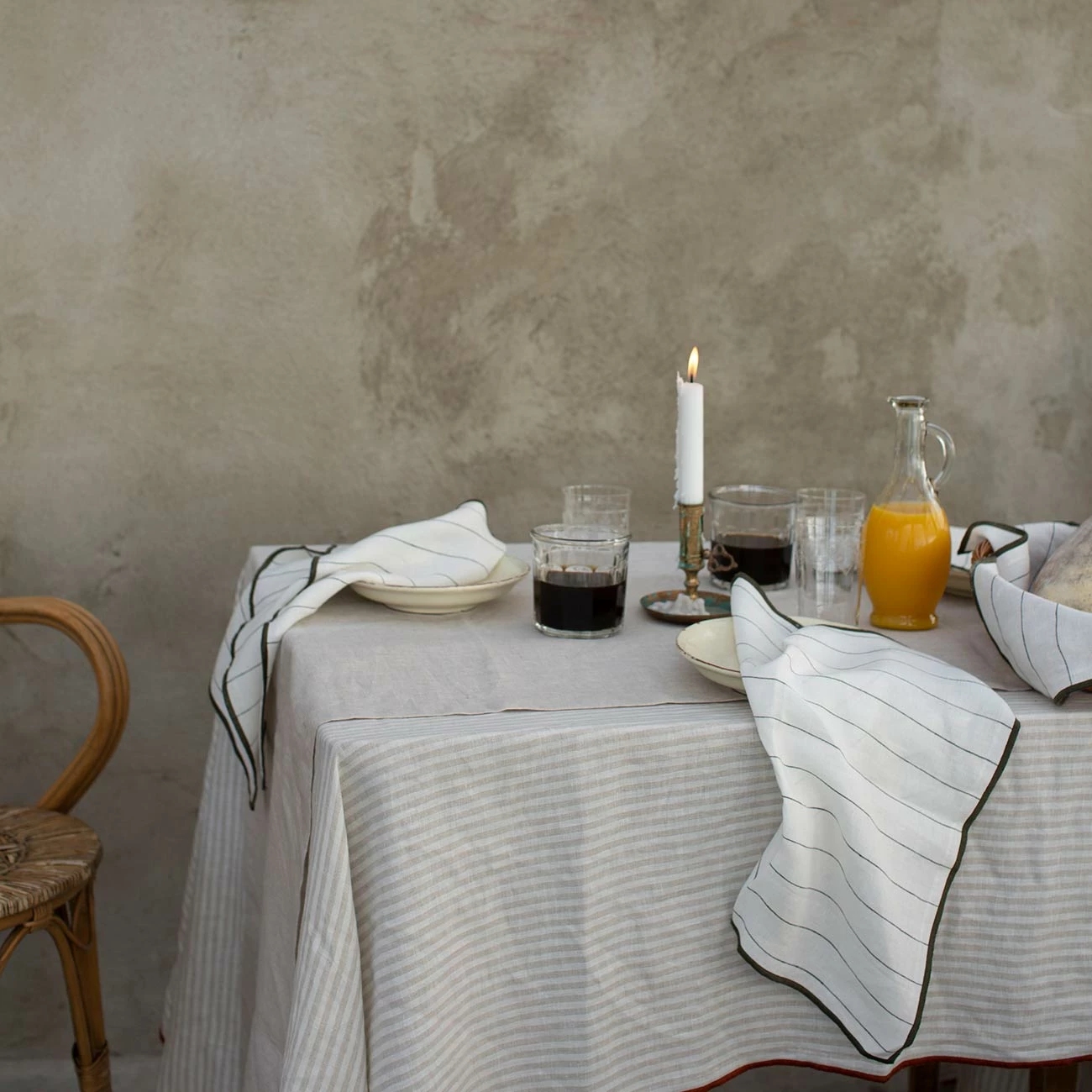 Made in Portugal, our Linen Napkin Set consists of a set of four napkins, made from 100% stonewashed European linen. Shown here in our classic Luna Stripe linen, embellished with a contrasting overlocked border in a deep shade of Avocado green. Complement your napkin set with the rest of our linen tableware range, including placemats, runners and tablecloths.