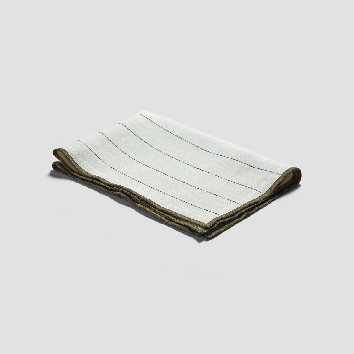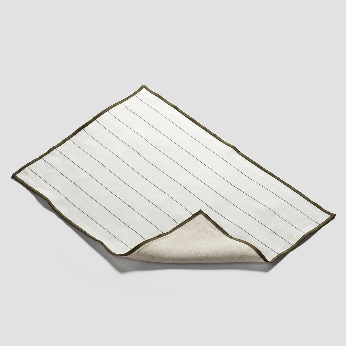 Made in Portugal, our Linen Set of Placemats consists of four beautifully crafted placemats, made from 100% stonewashed European linen. Shown here in our classic Luna Stripe linen, boldly embellished with an overlocked border in a deep shade of Avocado green. Complete your tableware set with the rest of our range, including napkins, runners and tablecloths.