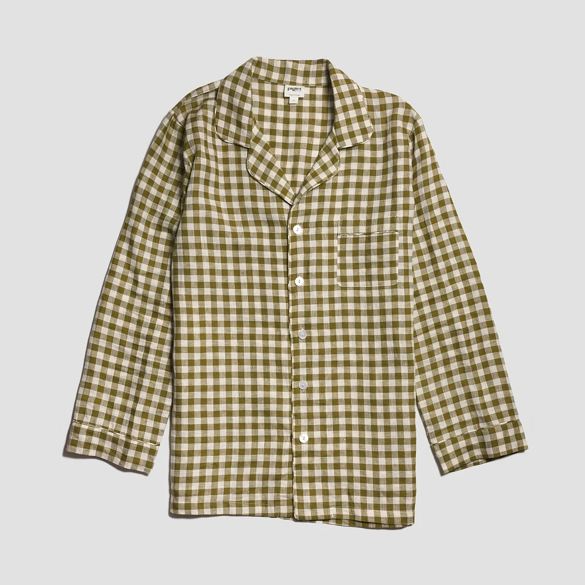 Men’s Botanical Green Gingham Linen Pajama Shirt (Top Only)