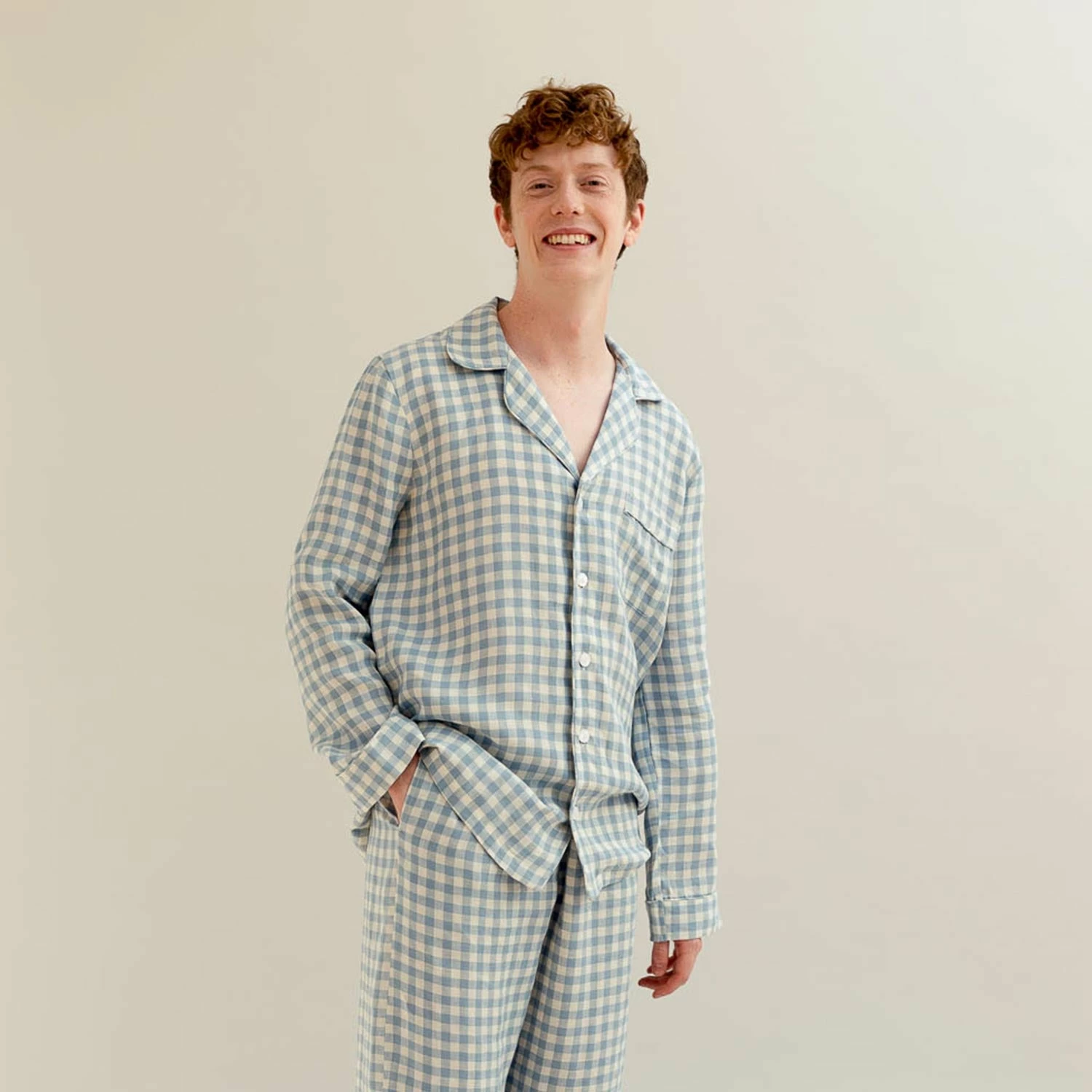 Men’s Warm Blue Gingham Linen Pajama Shirt