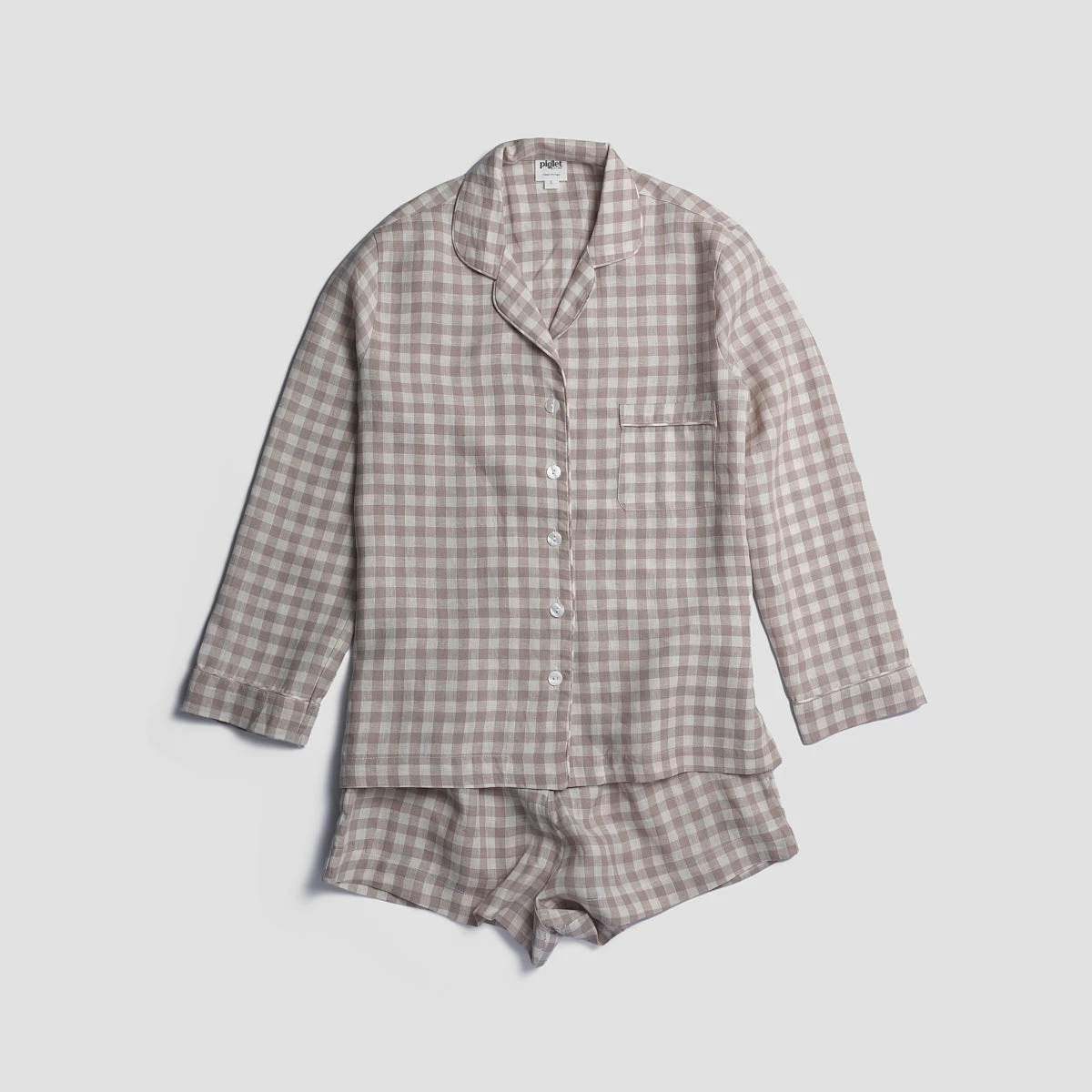 For a Blissful Night’s Kip For a blissful night’s kip, snuggle into nostalgic neutrals with our Mushroom Gingham Linen Pajama Shorts Set, made from super soft 100% stonewashed linen. Made for slow weekend mornings and cozy nights in, our gingham linen sleepwear collection is completely natural and thermo-regulating, keeping you snug during winter and cool throughout the summer. The shirt and short shape is classic, and perfect for those who want a mixture of cool and cozy.