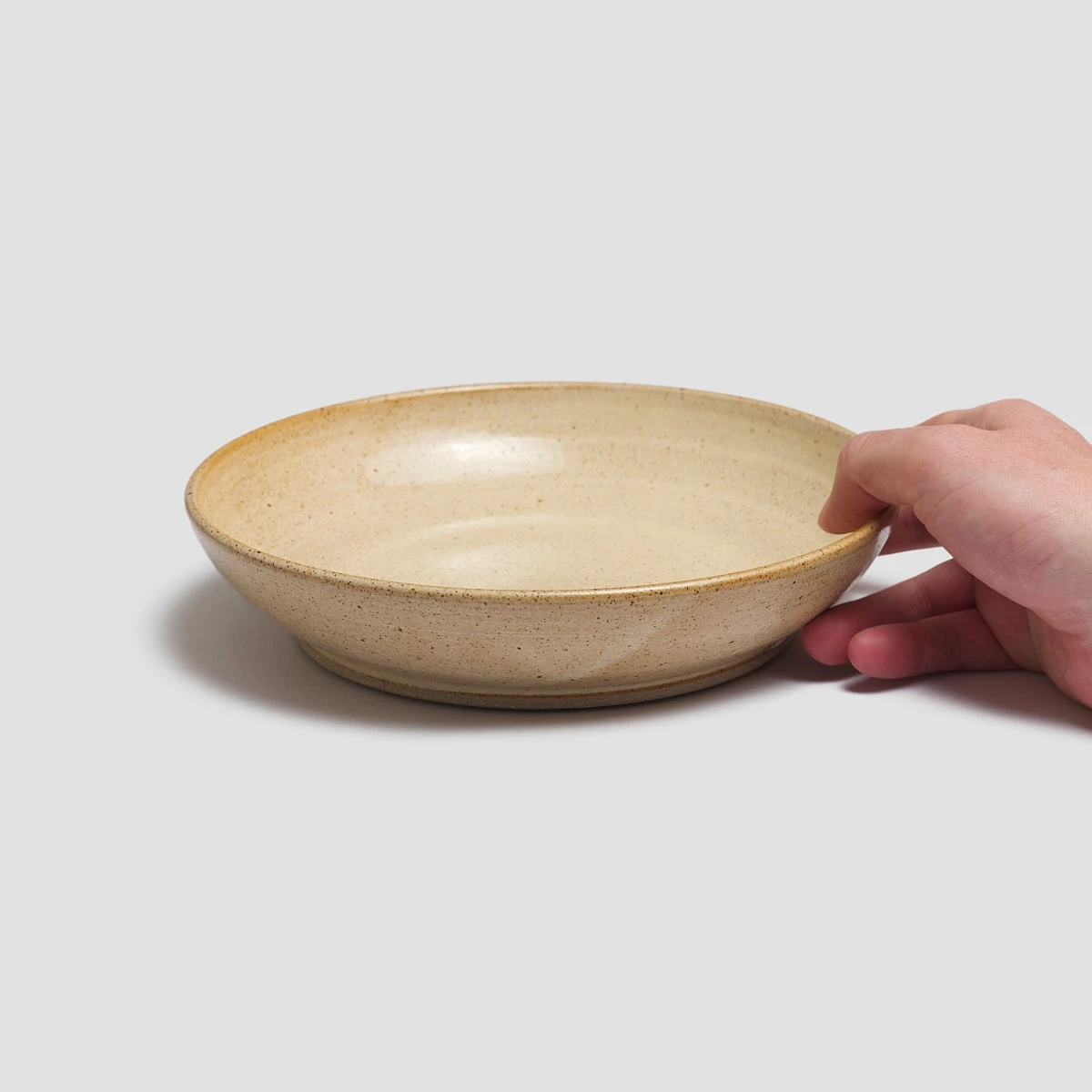 The Pottery West for Piglet Dinner Bowl has a beautiful, speckled finish and is perfect for entertaining or everyday dining. Each piece is hand-thrown in the Pottery West studio in Sheffield in the UK, using iron-rich flecked stoneware. The Sand glaze is a warm orange-brown hue with a washed look and plenty of iron speckles showing through from the clay.
