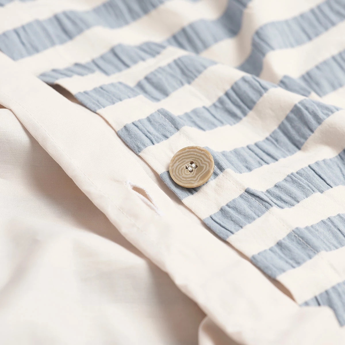 Inspired by the nostalgia of childhood holidays spent on the British coast, our Warm Blue Seersucker Stripe Cotton Bundle features an alternate stripe of Parchment and Warm Blue: a playful shade of blue. Made in Portugal from sustainably-sourced cotton, our seersucker stripe cotton bedding is achieved by weaving yarns of different tensions to create a relaxed, puckered effect, allowing for a breathable, cool and comfortable sleep. If you are looking to mix and match our Warm Blue Seersucker Stripe range, our plain washed cotton styles: Red Dune, Butterscotch or Mulberry make for a charming bedding ensemble.